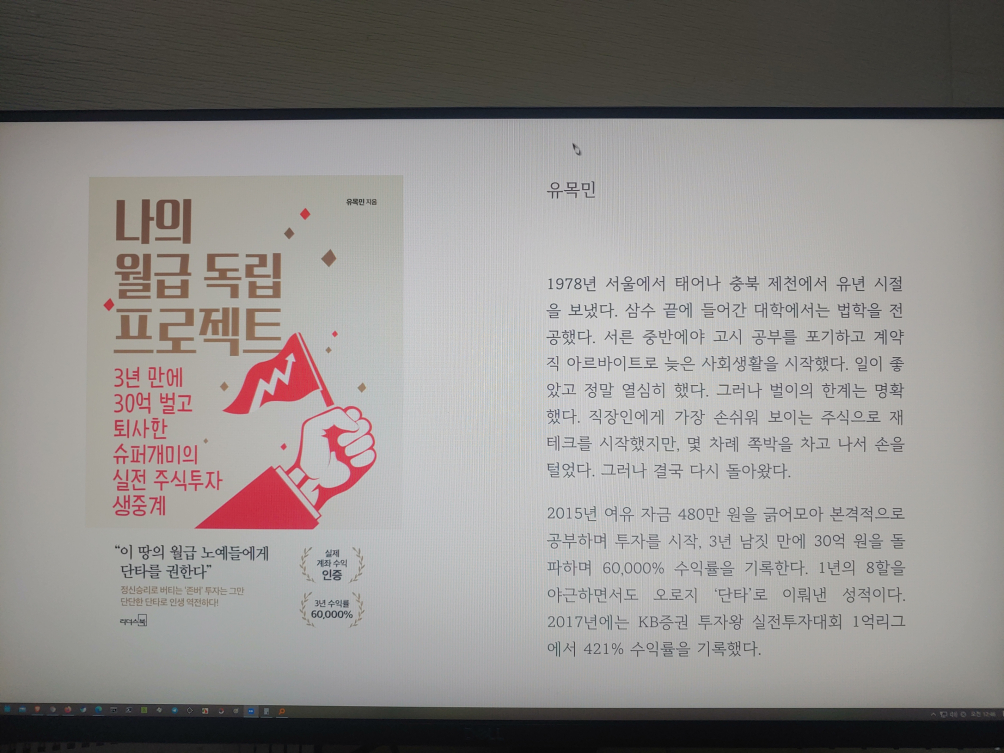 내가 이해한, 저자가 말하는 바는, 스토리텔링(테마)을 가지고 주식을 사고 팔고 해서 수익을 내는 것이었다. 10억 벌고 싶다! 특히나 2018년 4분기에 양가 부모와 함께 유럽 여행을 두어달 했다는 이야기는 부러웠다. 궁금했던 운용 금액이 커지면 어떻게 매매를 해야하는지, 그만의 방법이 있는지 궁금했는데 없었다! 여러 회사의 주식통장을 이용했다는 이야기는 있고, 미국, 중국 주식이야기는 없었다.