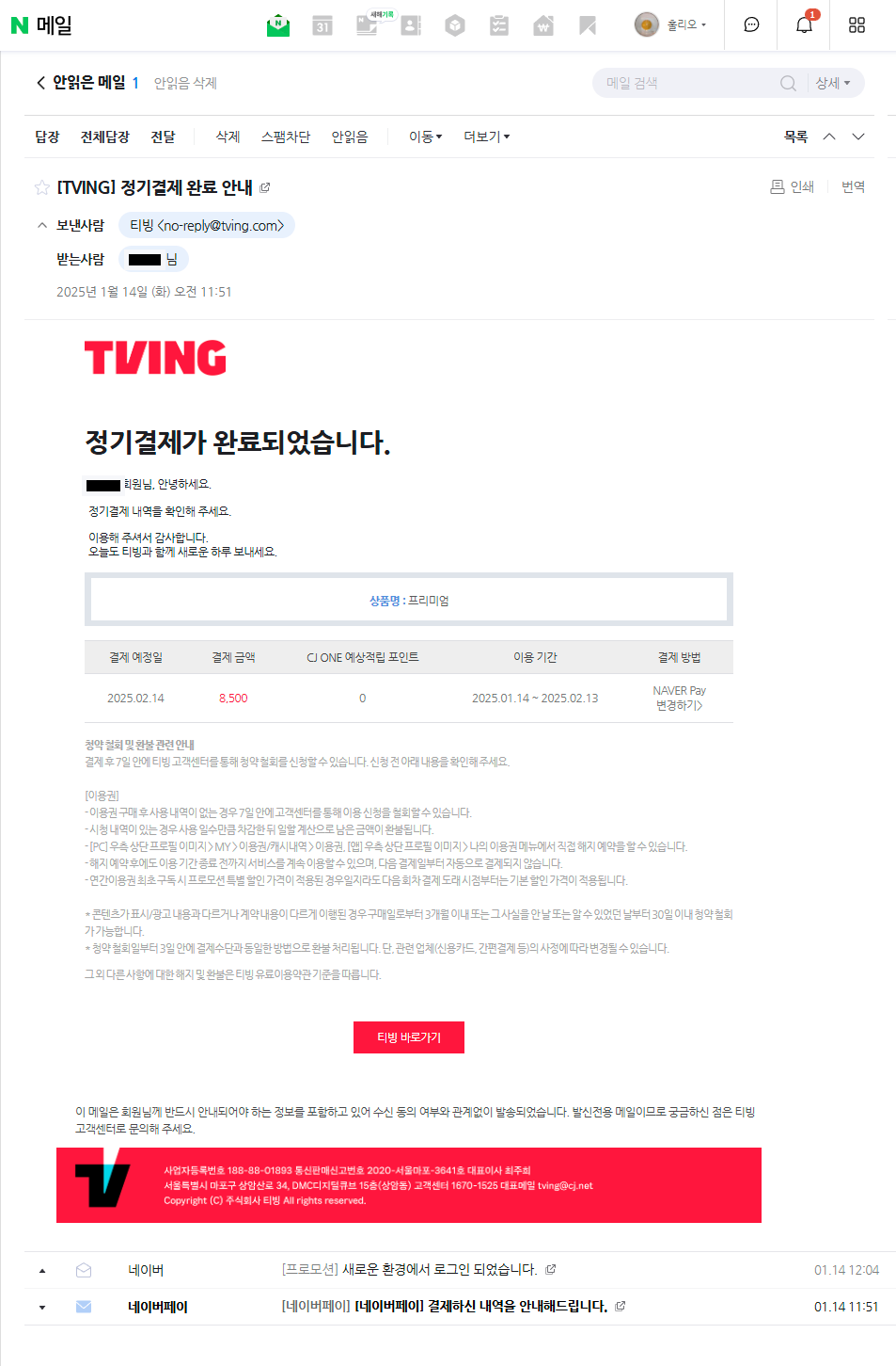 한국 컨텐츠 기업이 있는게, 배우나 우리 관련자에게나 다 이로울테니, 소비자인 내게도! 그렇게! 티빙이 네이버 컨텐츠에서 빠지면서, 프로모션으로 기존 네이버플러스멤버십 이용자에게 3개월 50%로 이용할 수 있게했다.