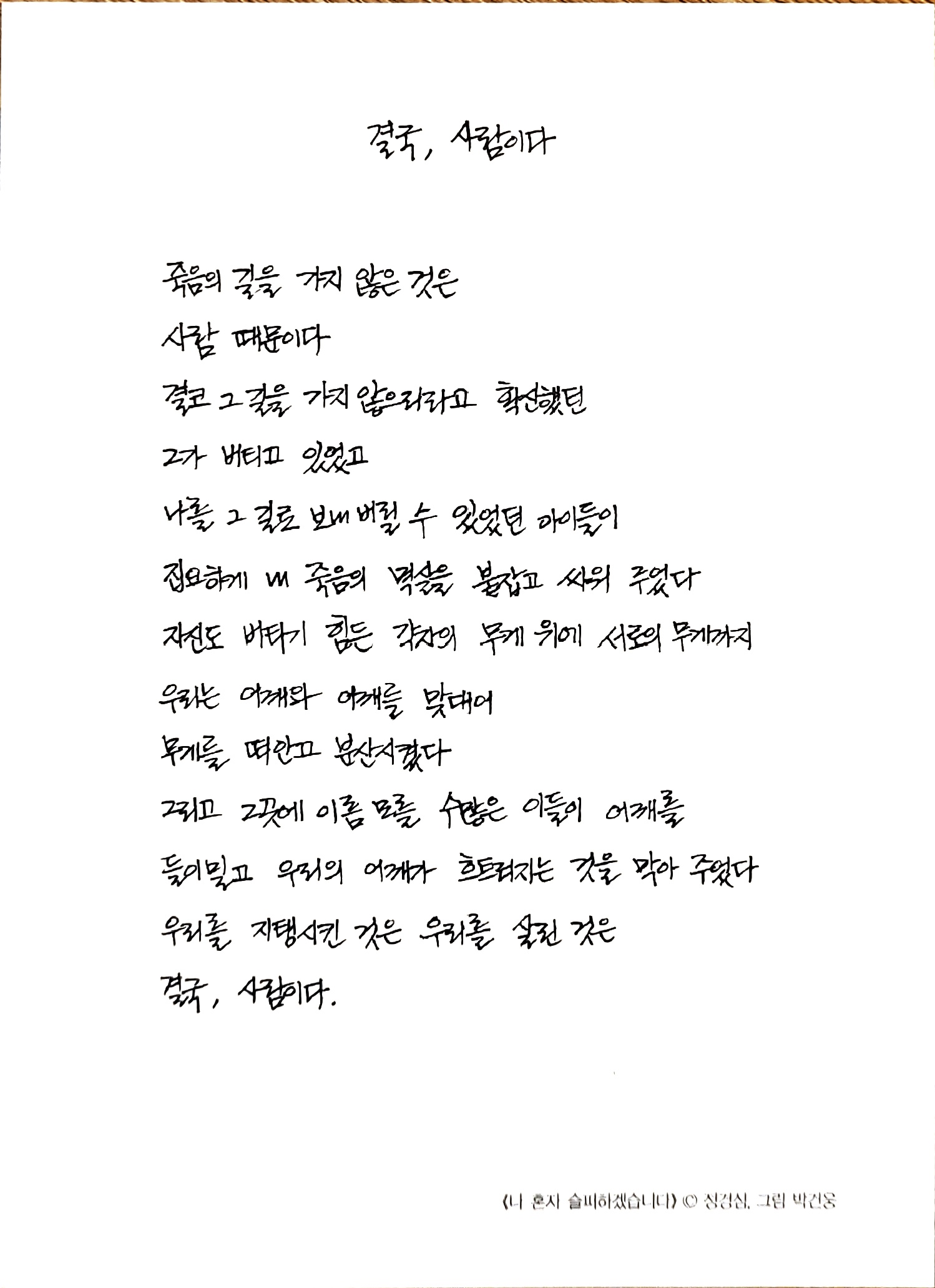 오늘 비닐에서 이 작은 시와 그림을 빼 ,읽는 책의 갈피로 쓰기로 했습니다. 디케의 눈물 268과 269 페이지 사이에 꽂으며 위로 받습니다.