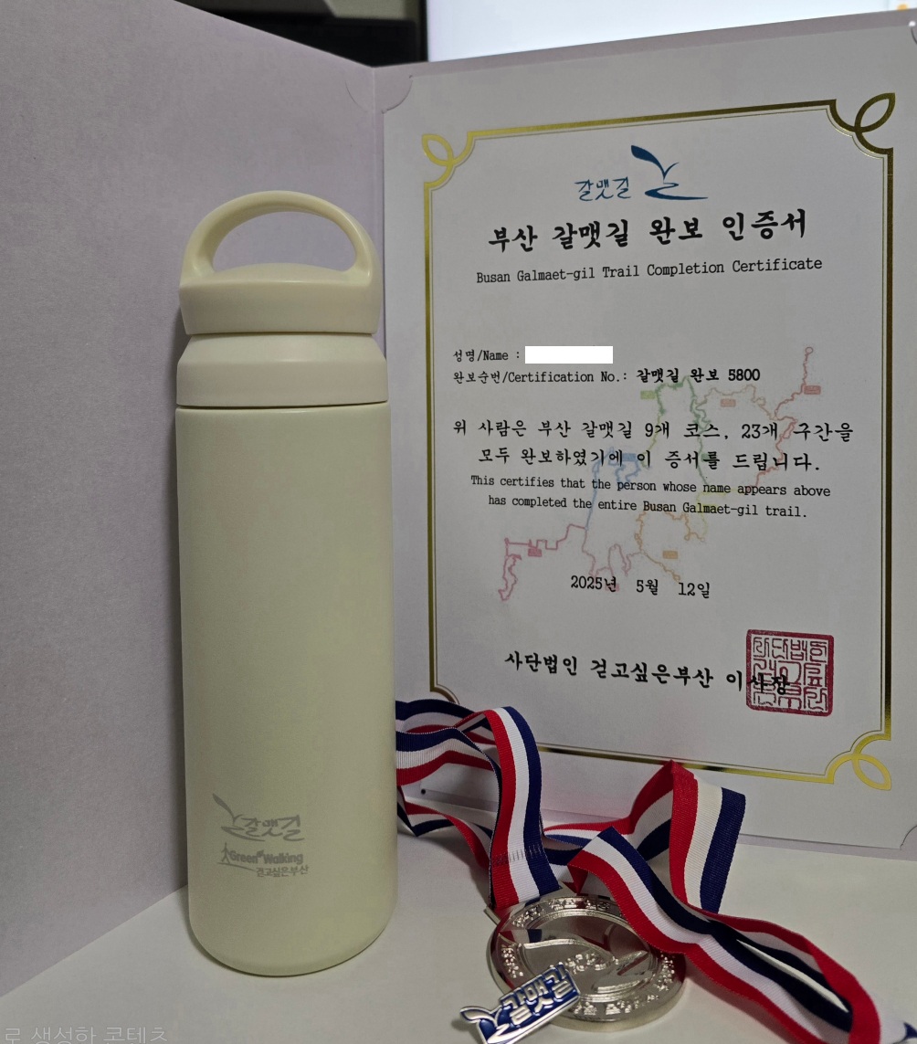 인증서가 안와서 전화를 해보니, 잉 누락이 되어 뒤늦게 다시 요청해 1회만 주는 상품(받고 알았다. 텀블러(물이 샘), 뱃지, 메달,인증서) 이런 구성으로 받았음
