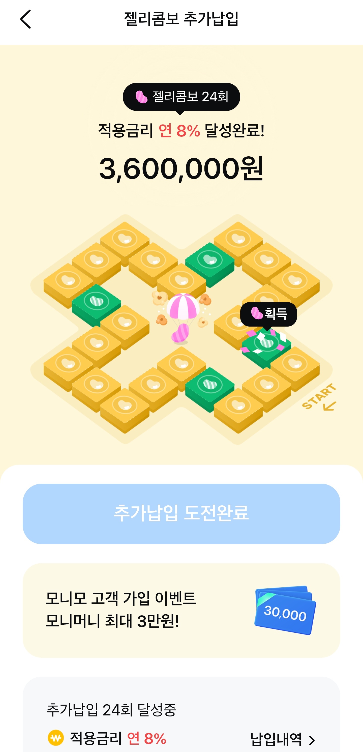 월요일마다 납입할 때 젤리를 주는데, 젤리는 모니모 앱에서 사용되는 현금성 상품. 다만, 여행콤보/젤리콤보 상품명도 다른 것 처럼 혜택이 좀 다르다! 만기 되어서 그냥 기록상 적어둠. 총 내가 낸 납입금은 720만원이고, 이자는... 받아보면 그때 기록 추가할 예정임!