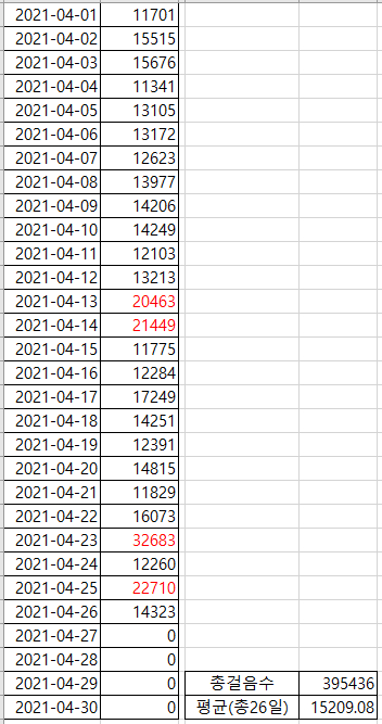 역시 하루도 빠지지 않고 만보는 걸었기에 평균값을 보면 매일 봤던 수치보다는 훨씬 높다. 평균만5천보라니, 그렇다. 꾸준히 하면서 4일만 좀 길게 걸었던 것이 평균값이 훨씬 높아 보이는 것이다.
