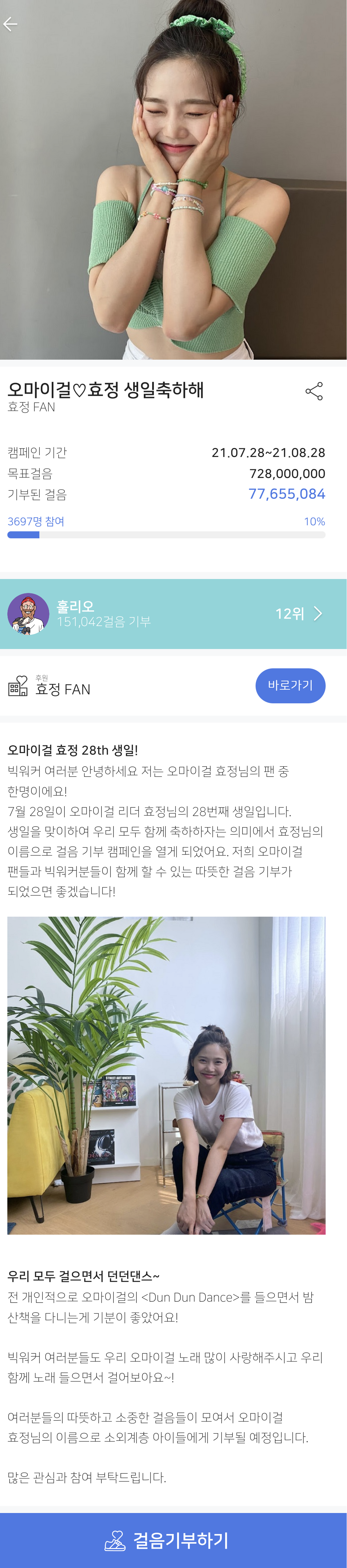 이번 캠페인 중 "오마이걸♡효정 생일 축하해"로 728,000,000 걸음을 8월28일까지 모아 소외계층에 기부