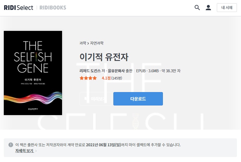 우연하게도, 마이크로 코스모스를 읽었다(아니 들었다). 그런 뒤 고민 끝에 월말 김어준을 구독했는데, 6월 꼭지 중에 이기적 유전자가 있었다. 두번 들었다. 옛날 구매했으나 읽지 않았던 ^^; 잊어버린 책(?)이기도 했는데, 운좋게도 리디셀렉트에서 6/13일까지 읽을 수 있다는 것에 시작! 40주년 기념판은 서문을 추가하지 않고, 40주년 기념판 에필로그를 추가함.