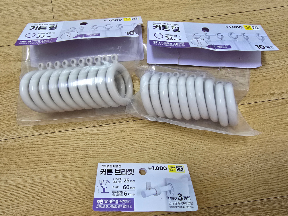 그런데 가져와 거실 설치 하려니, ... 역시나 다이소가 이케아를 방해하고 있음을... ... 커튼링(10개x2개) 2,000원에다가 봉 고정(커튼 브라킷1세트3개) 1,000원으로 설치 1차 완료해서 사용하지 않은 이케아 부속품은 반품하고 투명 흰커튼 하나사야지! 했습니다.