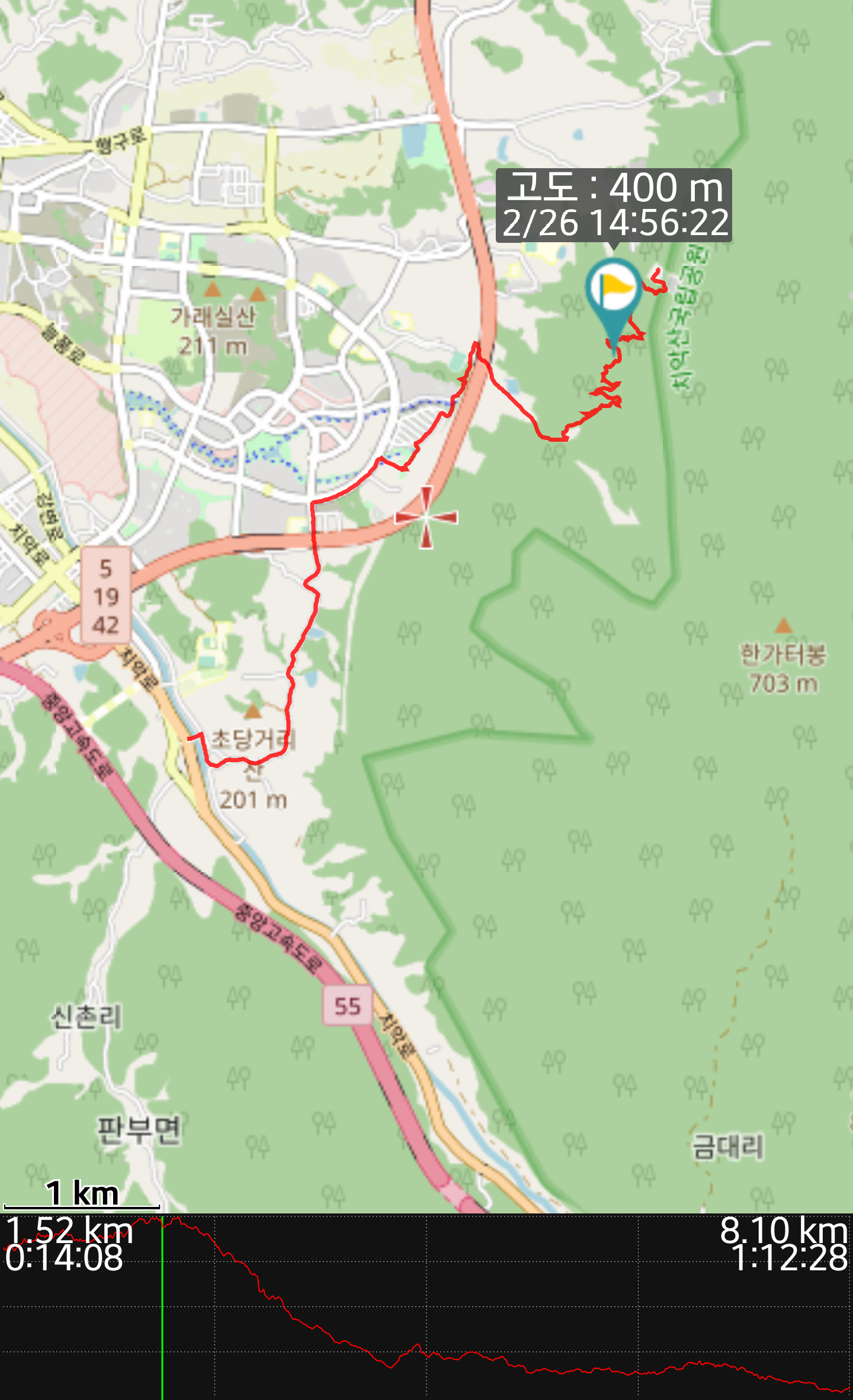 신기하네, 국형사에 출발해서, 보배사거리까지 오르막은 성큼성큼 내리막과 평지는 달렸다. 그러다 감기기운에 내가 졌다. 그냥 빨리 걷기모드로 11번 시작 지점 도착!