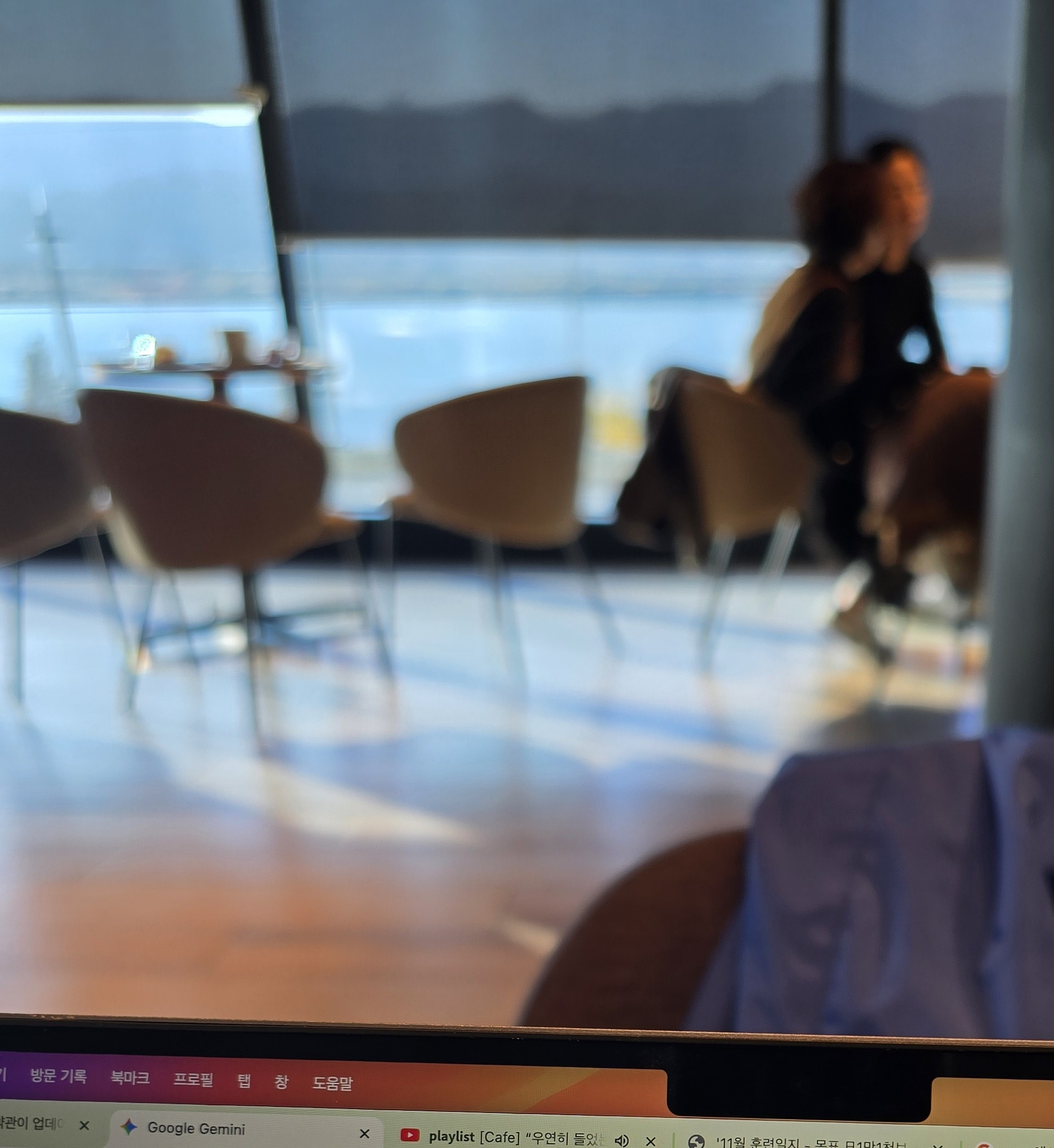 카페에서 올만에 맥프로 가져가서 서칭하는 중에, 낙동강 보면서 햇살도 좋고, 앉은 자리 바로 앞에 그렇게 두분의 여성(적확히 표현하면 아주머니 두분, 나보단 나이가 많아 보이니 60대 일 것 같으니... 큰 누님 정도로, 그렇게 여성 세 분이 2시간은 넘게 이야기 하는 걸 보면서, 거기엔 기둥 뒤에 있는 한분 포함 화장실도 안가는 ㅋㅋ ... 사는 재미에 꾸준한 이야기와 그 호기심을 부러워 했고, 그러다 신발 보고)을 찍었고, 노이즈 캔슬링 이어폰을 착용하고 있어 무슨 이야기 한 것은 관심도, 소리도 듣지 못했다!
