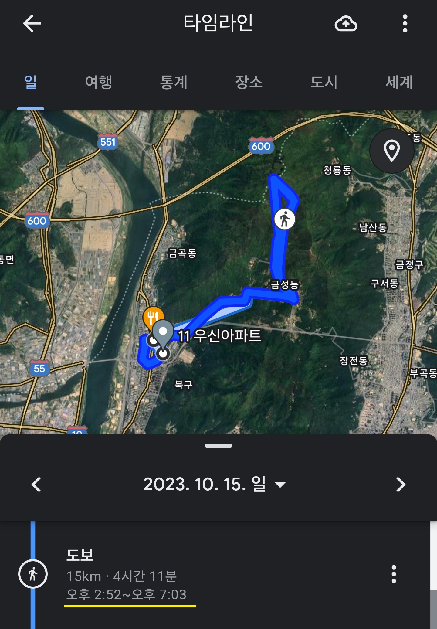 기록을 남기지 않았더라! 산길샘도 하지 않은 작년 10월15일 그날은 그랬을 것이다. 형님을 먼저 보내고, 이렇게 걷기만 하는 날이었다. 하지만 기록으로 찾아 볼 수 있는 것이 출발 지점의 사진 기록과 서문 근처 사진, 북문 통과 사진, 정상 사진, 그리고 금정구1 마을 버스 타기 전까지를 보수적으로 산행시간으로 해서 기록해 놓으려고 씀.