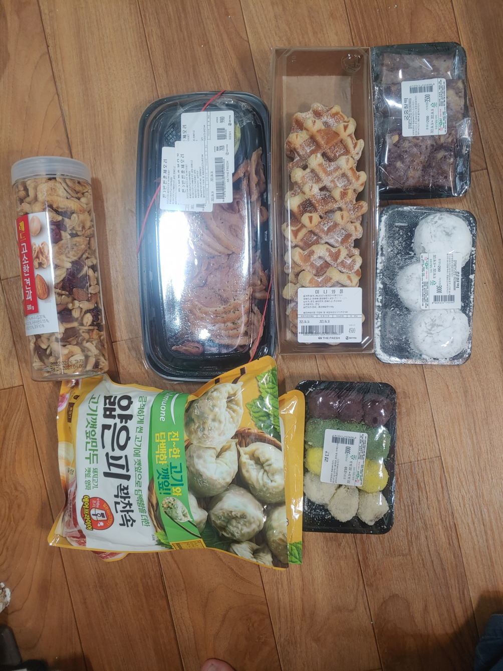 마트에서 반훈제오리고기,견과류1통,떡3,만두2,미니와플까지 구입.