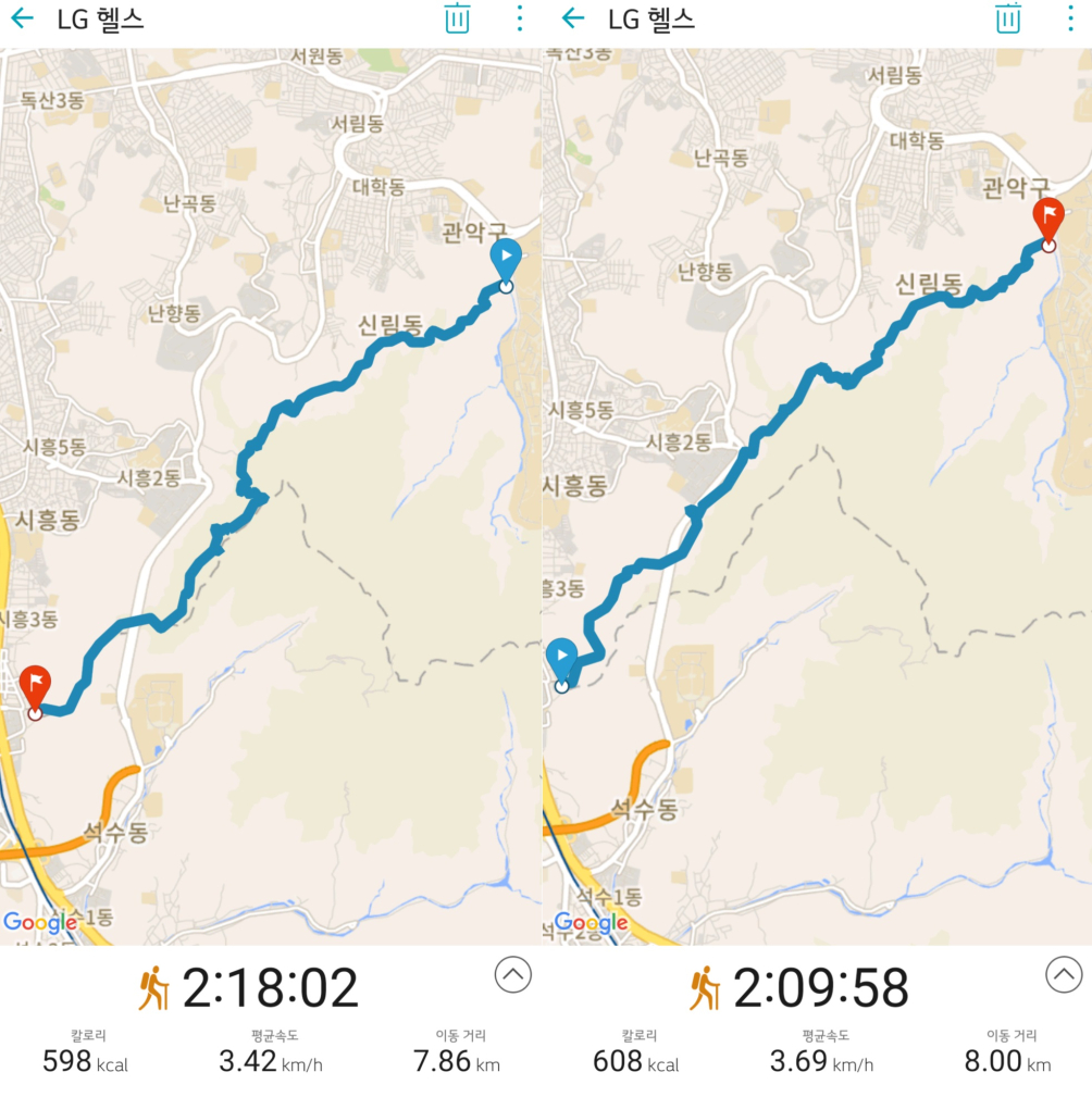 산행이 들어가서 이렇게 차이나는 듯. 첨으로 걷다가 집에와 볼일 보고 다시 나감.