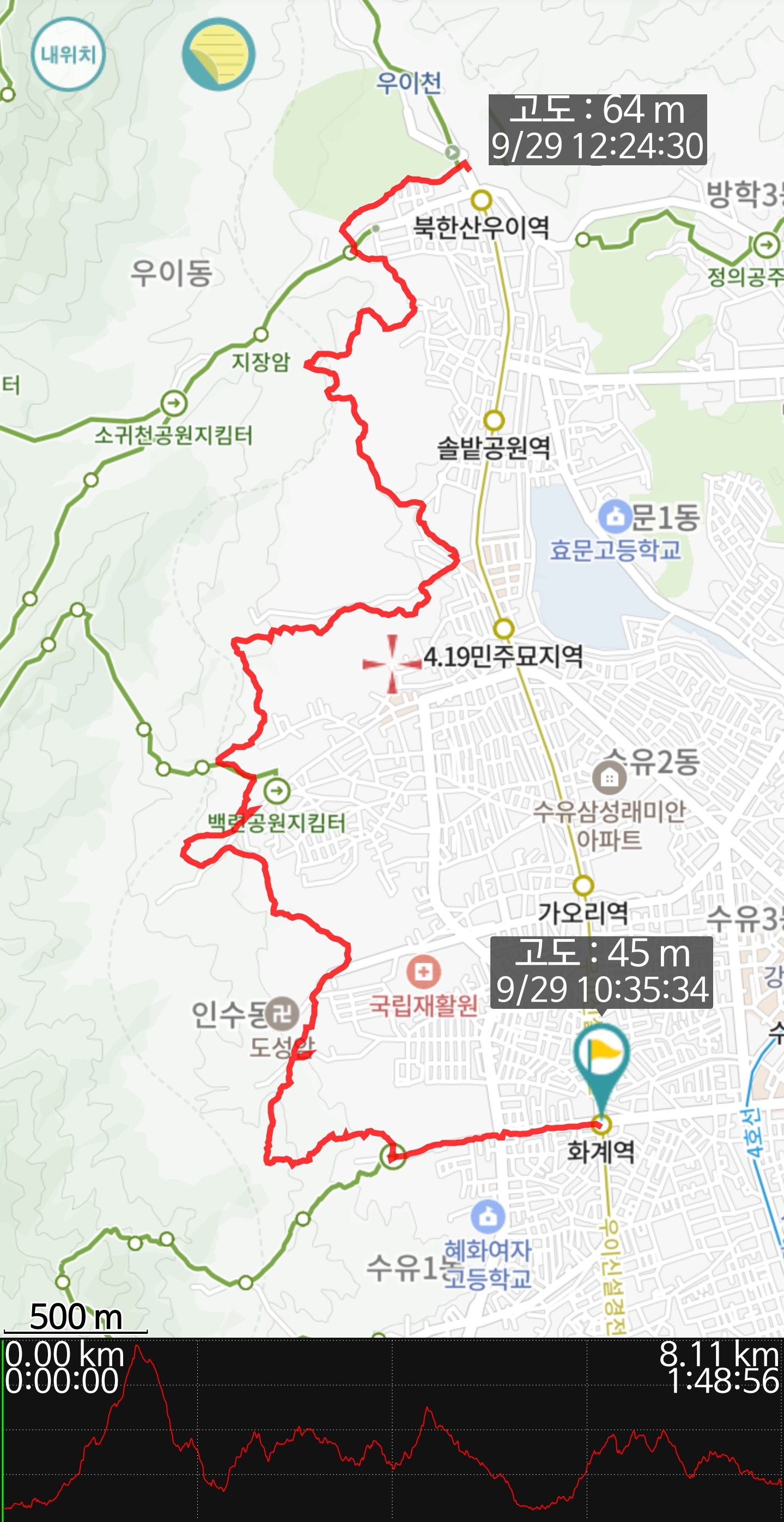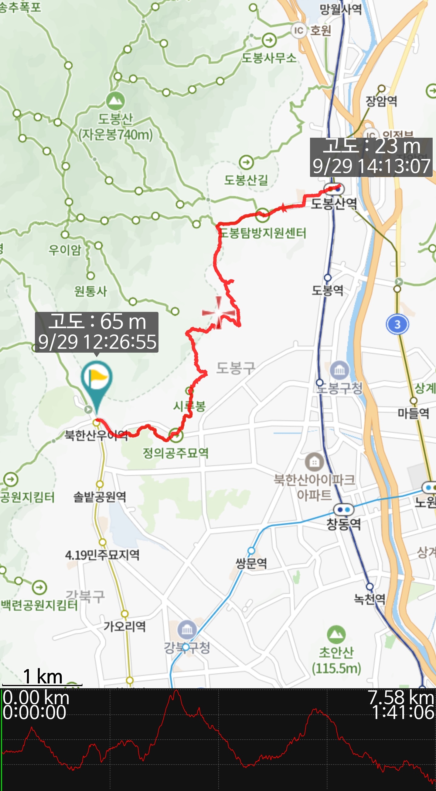 7시 전에 일어났으나, 침대에 있다가 샤워하고 집앞을 나서니 09:20 천천히 걸어 지하철 타고, 화계역에 도착해 09월29(일) 10:35:34~16:44:05 (스템프 찍는 곳에서 끝난 시간: 휴식시간 포함, 잘못간 길, 다시 1코스 출발지까지 가서 도장찍고 다시 온 것 포함한 시간)입니다.