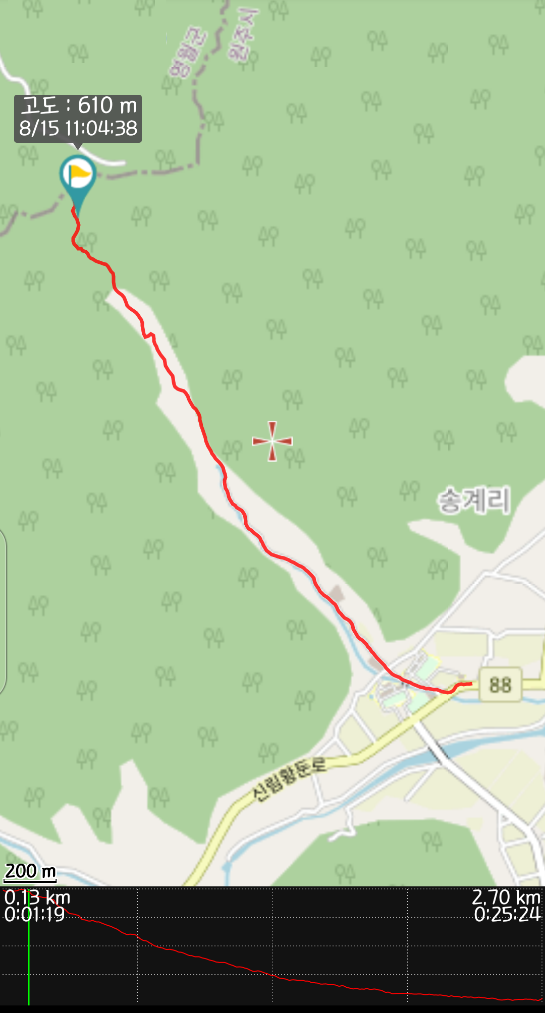 시계방향으로 걸으면 이렇게 이쁜 길인데, 체력고갈로 속도를 내지 못했던게, 2시간 18분인데, 오르막 시간이 더 짧다는 것이 위안! 05구간 시계방향 시간 단축하려다, 04 구간을 위해선 아래 길을 걸어봐야 했음으로 단축은 시키지 못함. 05는 정말 인공적인 느낌이 강력(?)했던 구간이다. 그러나 계곡에서 올라가는 길은 수레너미의 인공이 없어 외려 좋기도 했다!