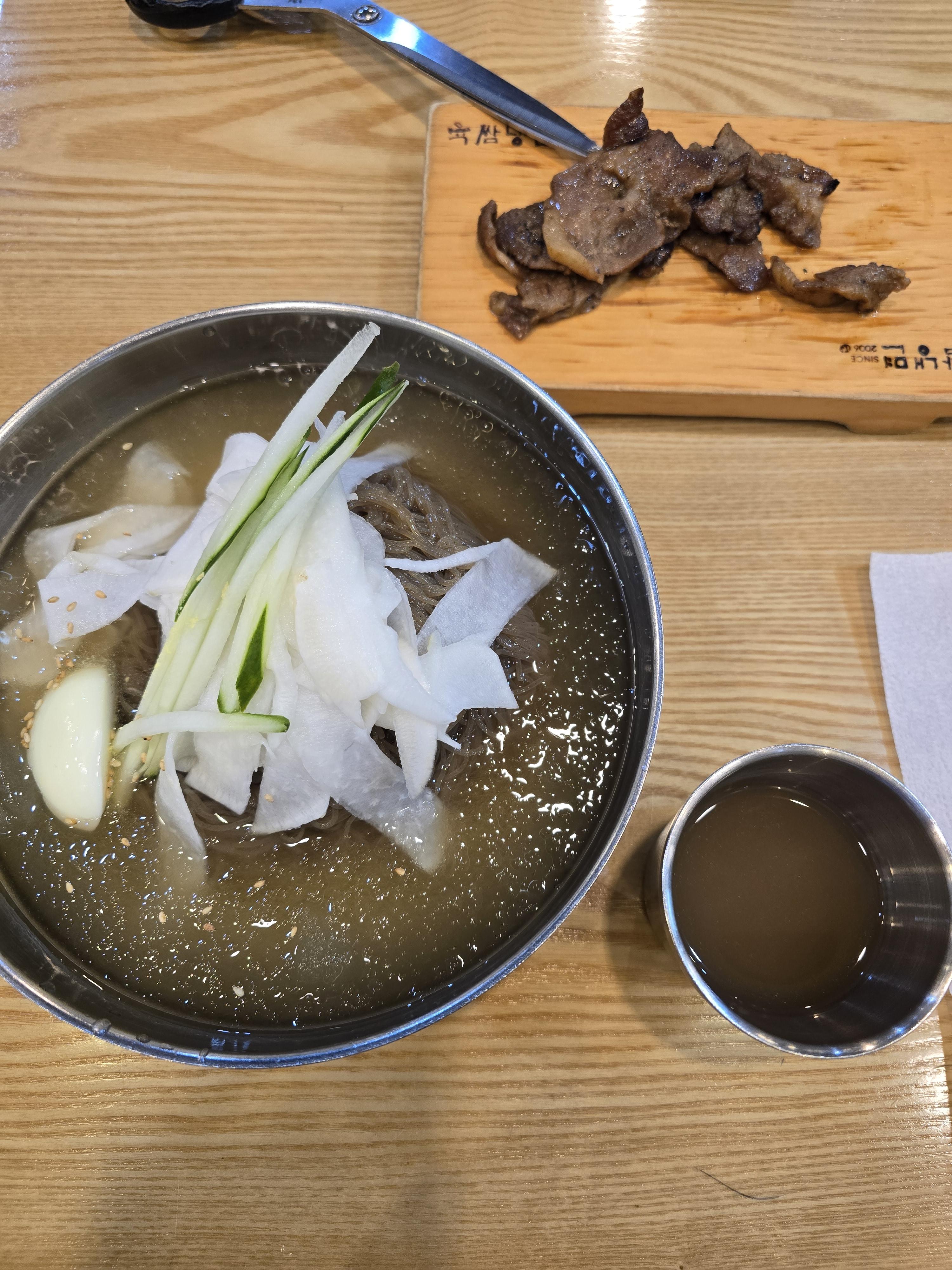 그렇게 사가정역에서 육쌈냉면 브랜드를 보고 들어가 물냉면 꼽배기 먹고 지하철 타고 귀가. 울 동네는 사라졌기 때문. 맛있다기 보다 그만한 가격에 혼밥먹는 사람으로선 고기와 냉면을 한꺼번에 먹는 건 나쁘지 않다. 따뜻한 육수를 4잔이나 마셨다. 그렇게 걷기에서 빠진 수분 보충하고... 아흐 고기는 꼽배기가 아닌지... 냉면은 배불리 먹었다. 그리고 다행한 건 사가정역에서 한번에 이수역까지 와서 편하더만. 지하철을 자주 이용하지 않아 둘레길 걸으면서 좀 파악하게 되었음.
