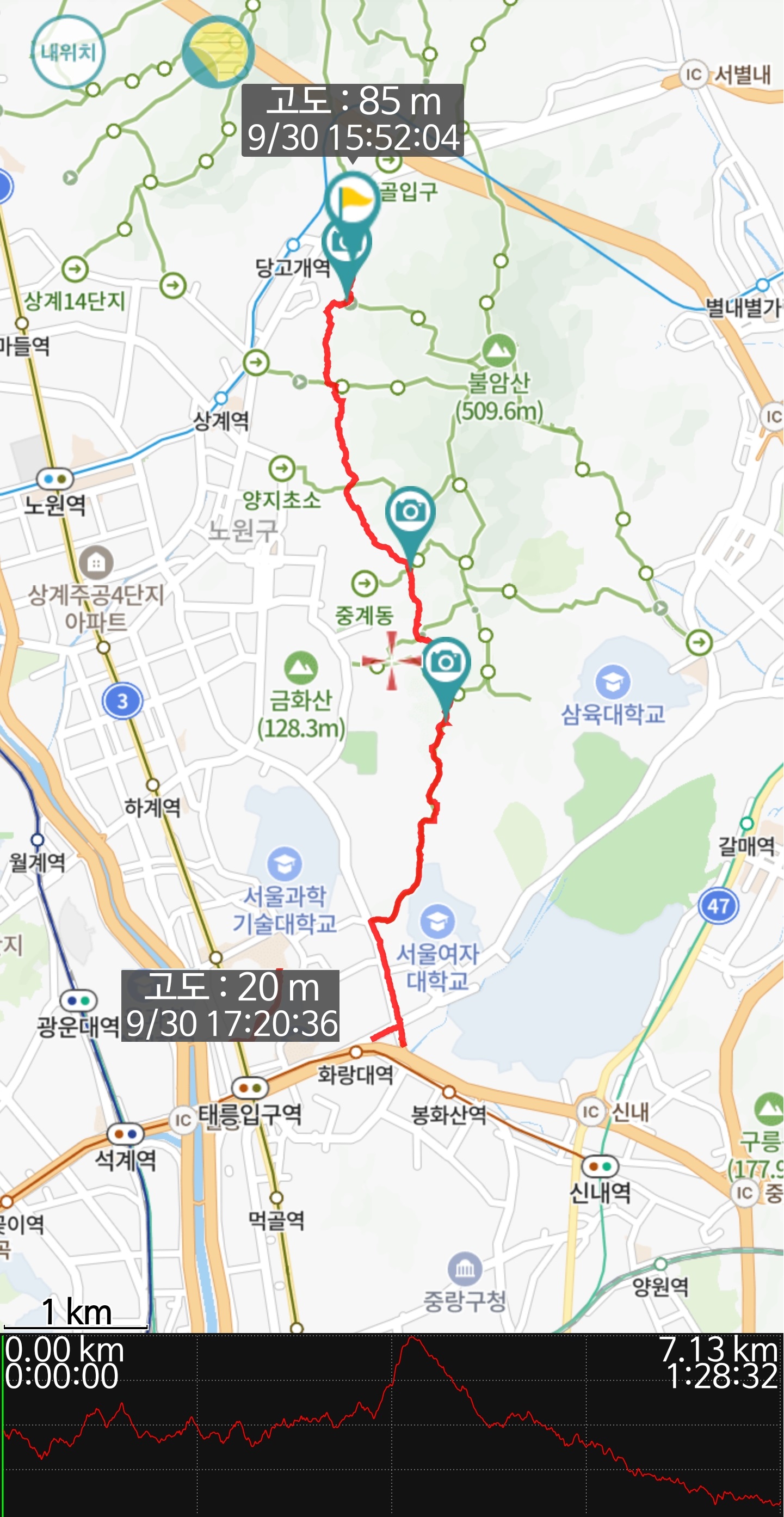 전셋집에서 세탁기를 없앴던 것은 큰 실수! 고장난 것도 아닌데 왜 그걸 버렸는지... 그렇게 손빨래를 하는 편인데, 그저께도 둘레길 세코스를 걸었기에 집에와 빨래를 하는 중에 작은 빗 하나를 빼지 않고, 큰 대야에서 화장실 변기로 세제물 버리면서 변기가 부분 막혔고, 그런데 착각으로 카드까지 들어간 것 같아서 블로그로 검색된 전문가 (010-3999-1181: 상도동) 에 연락했는데, 잉 저녁에나 올 수 있다고 할 줄 알았는데, 12시에 올 수 있다는 말에 나가지 않고 기다려, 단순히 빗 하나 있어서 쉽게 해결이 되어 오후 1시 10분인가 나올 수 있어서 당고개역에 가서 09월30일(월) 14:20:57~ 18:51:17 (4:30:20 거의 쉬지 않고 진행, 4코스에 잘못 걸어서 돌아간 시간이 조금 있었습니다) 걸었습니다. 중간 역에서 귀가후 내일 가야지 했는데, 가보니 잉 중앙선이라 타면 꼬일 것 같아서 ... 거기에 4코스가 후반부가 길이 아주 좋아서 마음 편히 걸었네요. 다만 4코스 끝내고, 사가정역으로 복귀하는 코스가 깔딱고개란 이름이 붙여진, 그래도 내리막이라, 담엔 오르막도 경험하니 역시 다음 번엔 중간지가 아니라 경유지로 가서 이길은 경험하지 않는 것으로 계획하는 게 맞을 것 같습니다. 사가정역에서는 육쌈냉면 이란 간판에, 우리동네는 전업을 해서 간판 사라진 것을 봤기에 온김에 꼽배기로 귀가했습니다. 어제 만난 형님께서 길 걷고 나서는 그곳에서 한잔 하고, 구경도 하신다는 말에... 사가정역에서 저녁을 먹었던 것 같기도.