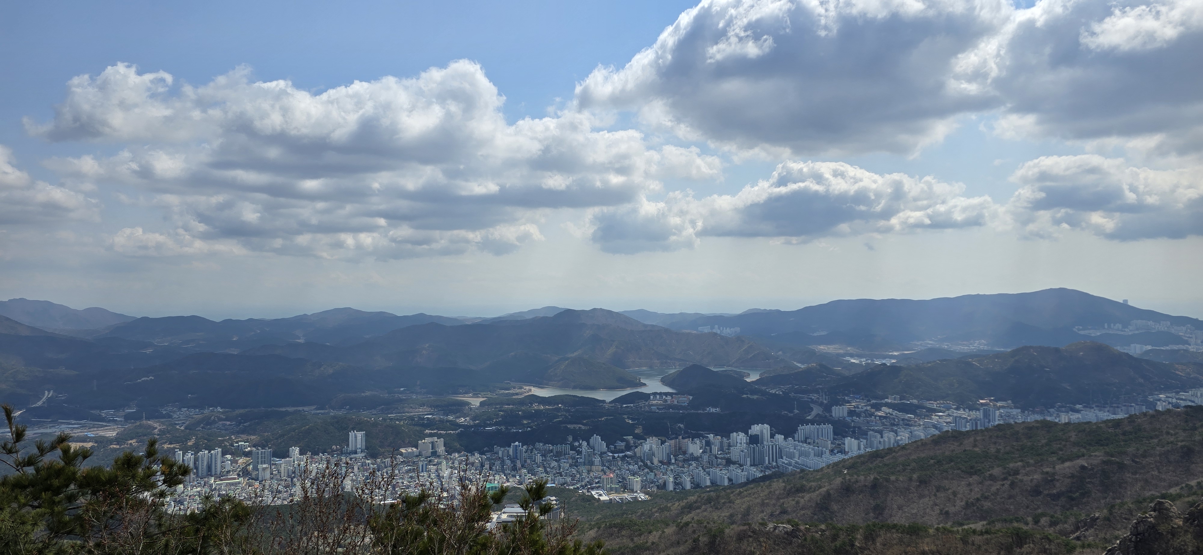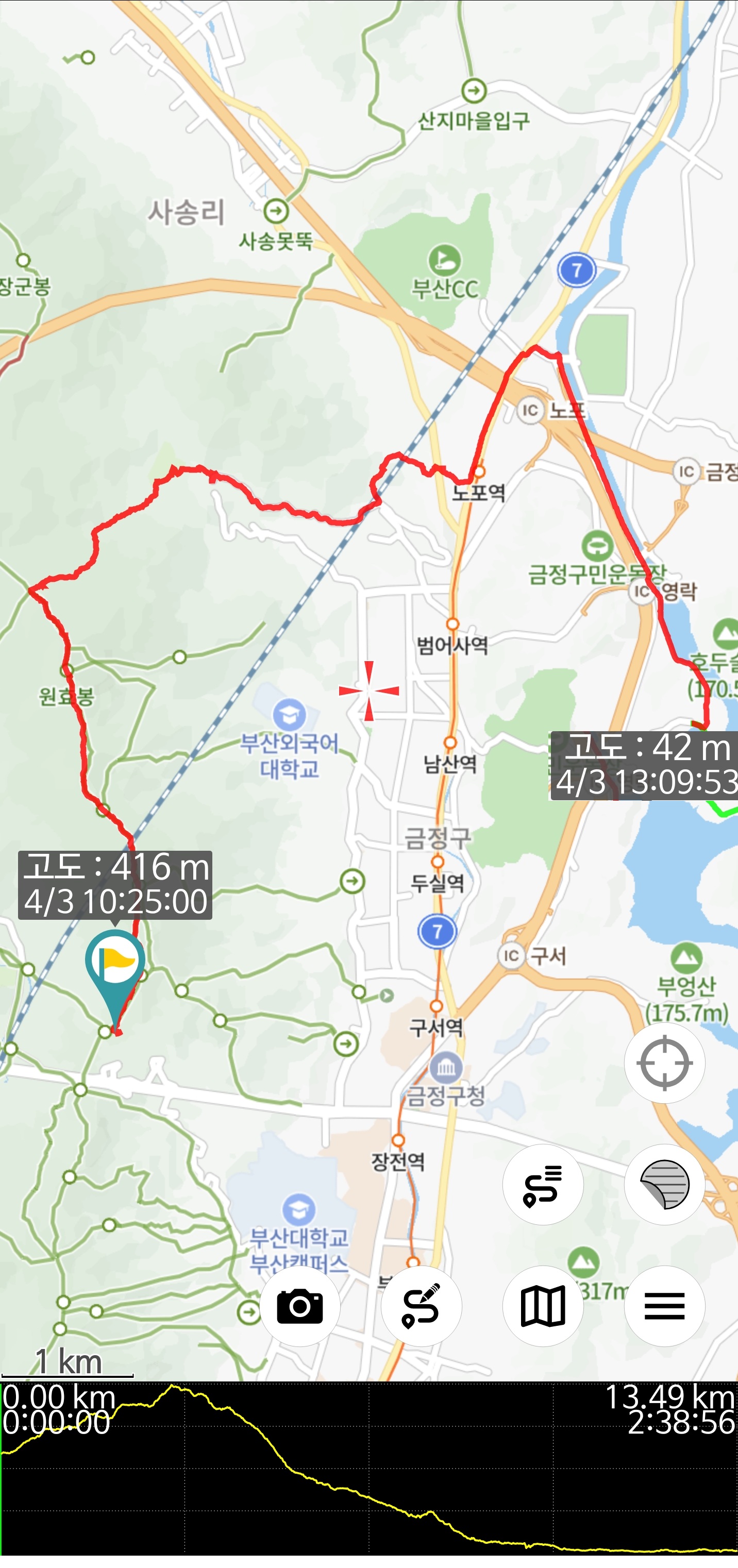 마을버스 타고 복지센터에 내려서, 금정산성 동문에 가서 원효봉을 거쳐 북문까지 올라가 거기서 부터는 내리막으로 범어사, 90번 버스 정류장 계단앞에서 중간 인증 하고 내리막길은 나무로 만들어진 길로 달려내려가 끝나는 부분에 산능성이를 타고 잠시 올라가 내려가서 작장마을 지나서 대략 2km 강 옆길 직진 길을 따라서 상현마을 도착했습니다.