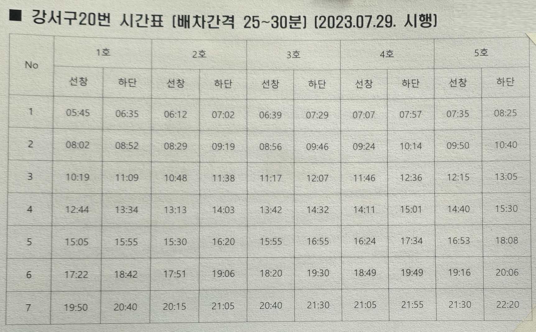 평일 버스 시간표 강서20번