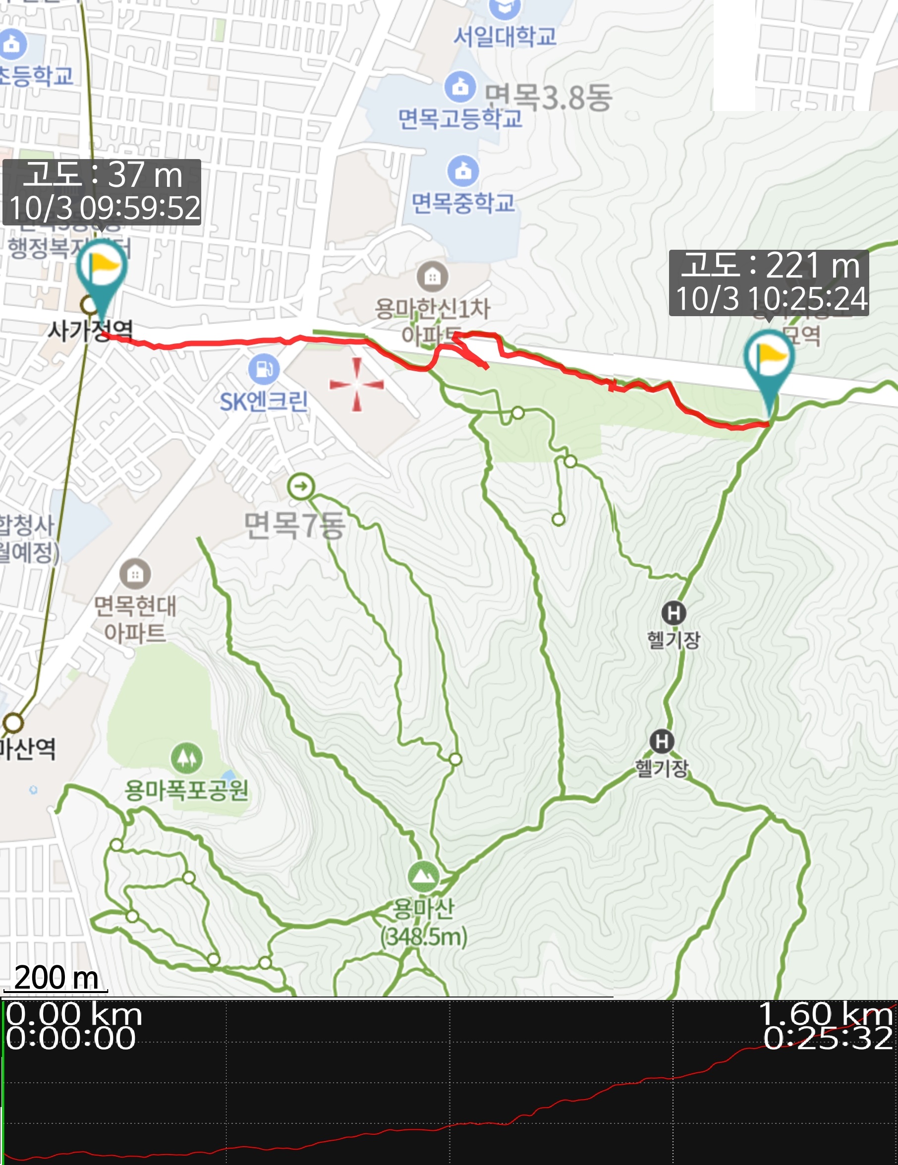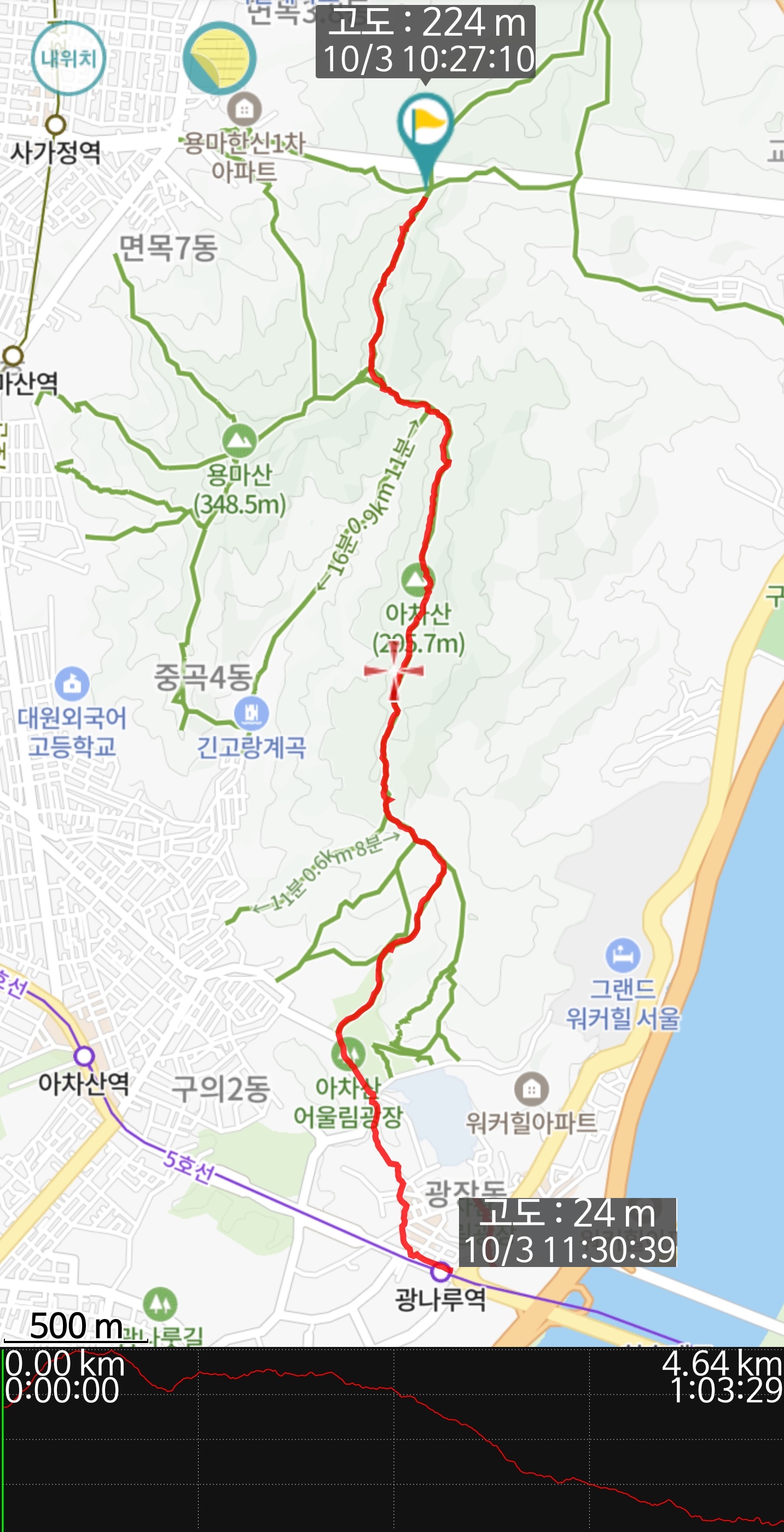 맞춘 것은 아닌데, 나오면서 시계를 보니 9시였다. 거기에 사가정역 4번 출구 에스커레이터 타고 나오니 10시 산길샘으로 기록시작 누르고, 하이킹 시작!