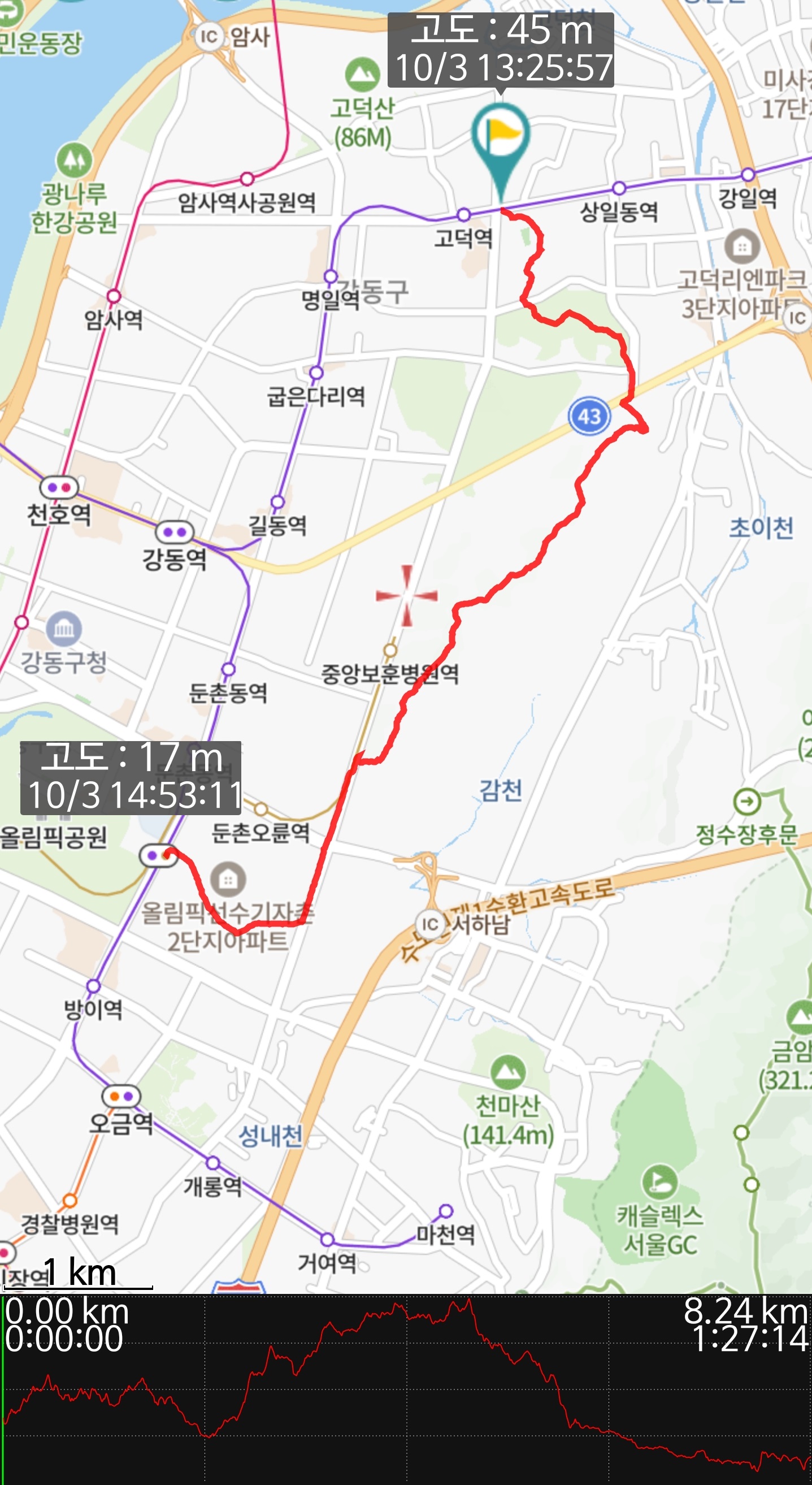 광진교를 걷다가 광진교 건너 내려오고서 부터 가방에 가지고 왔던 운동화로 바꾸고 달렸다. 그래도 제법 긴 거리에 암사 IC 부터는 고덕산도 타고, 명일동 앞에까지 오는데 한참 힘드네! 그래도 가져온 이온 음료 한통 다 마시고,