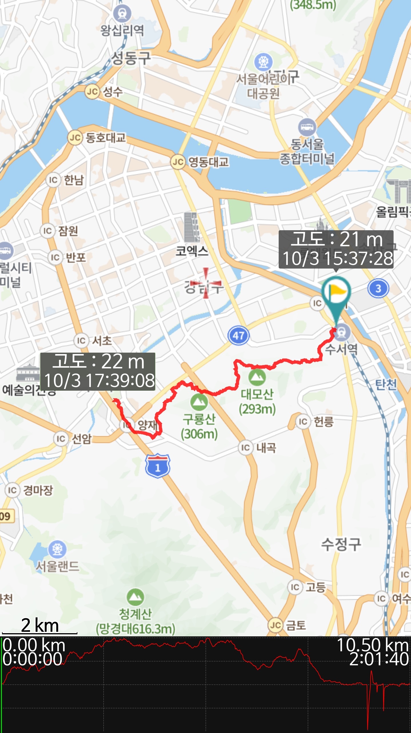 이부분은 좀 뛰었다. 시작 부분에 산길도 2계단씩 올랐고, 숨고르기 하면서, 이온음료 절반 시작전에 마시고, 올림픽공원 도착해서 가지고온 이온음료 2개 다 마심. 그런데 3시가 되지 않아 고고 수서역으로. 이 코스는 산도 높지 않아서... 경치는 보이지 않고, 따라 걷기만 했던 것 같다. 거기에 방이 생태보전 지구(여기까지가 7코스)에서 - 올림픽공원까지도 나름 거리가 되어 달렸는데, 3시 전에 도착했다!