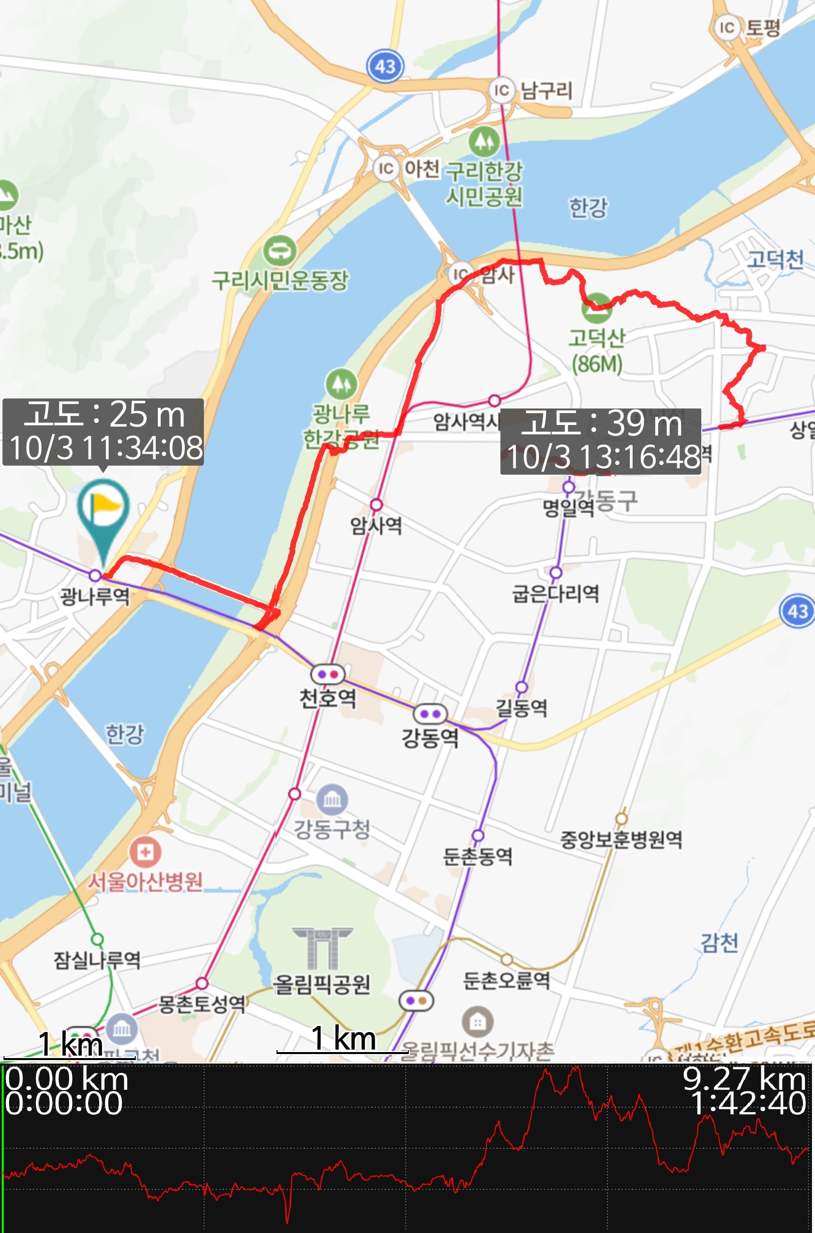 광진교를 걷다가 광진교 건너 내려오고서 부터 가방에 가지고 왔던 운동화로 바꾸고 달렸다. 그래도 제법 긴 거리에 암사 IC 부터는 고덕산도 타고, 명일동 앞에까지 오는데 한참 힘드네! 그래도 가져온 이온 음료 한통 다 마시고,