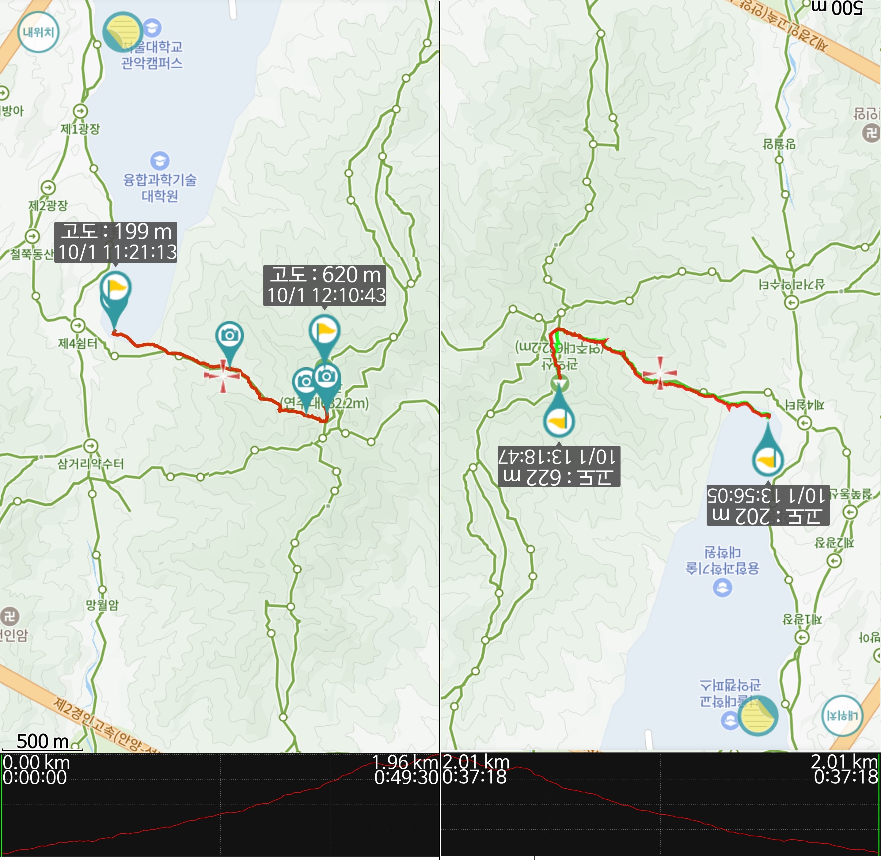 오를 땐 사진을 두어 컷 찍었는데, 내려올 때는 바위 타고 오지 않아 약간 둘러 내려가니 2.01km이고, 오를 때는 바위타고 넘어 500m정도 적게 거리가 나왔다.