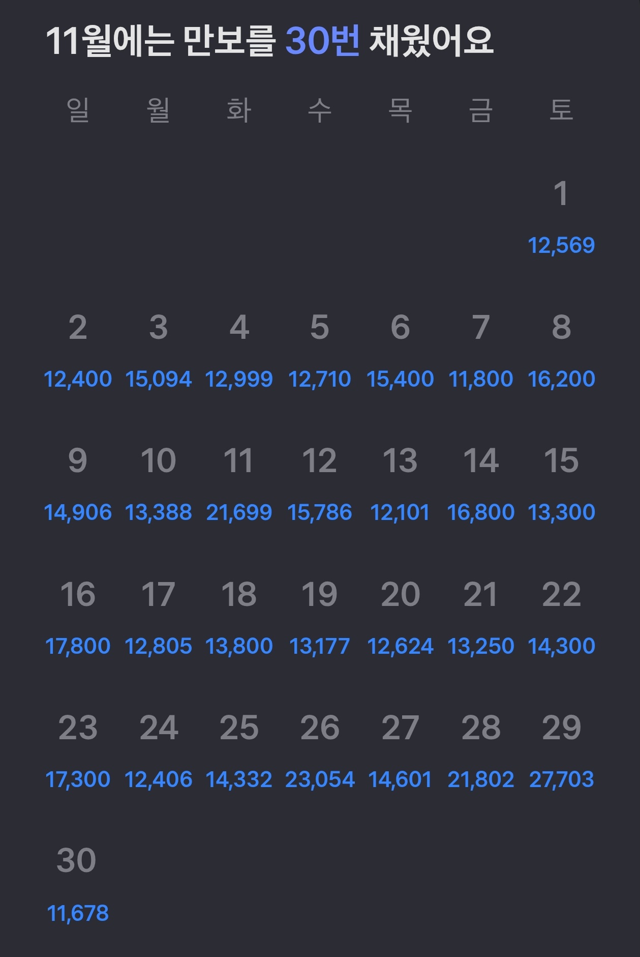 30일 일1만1천보는 걸었는데, 29일 스쿼트와푸쉬업을 했는지 안했는지 ...