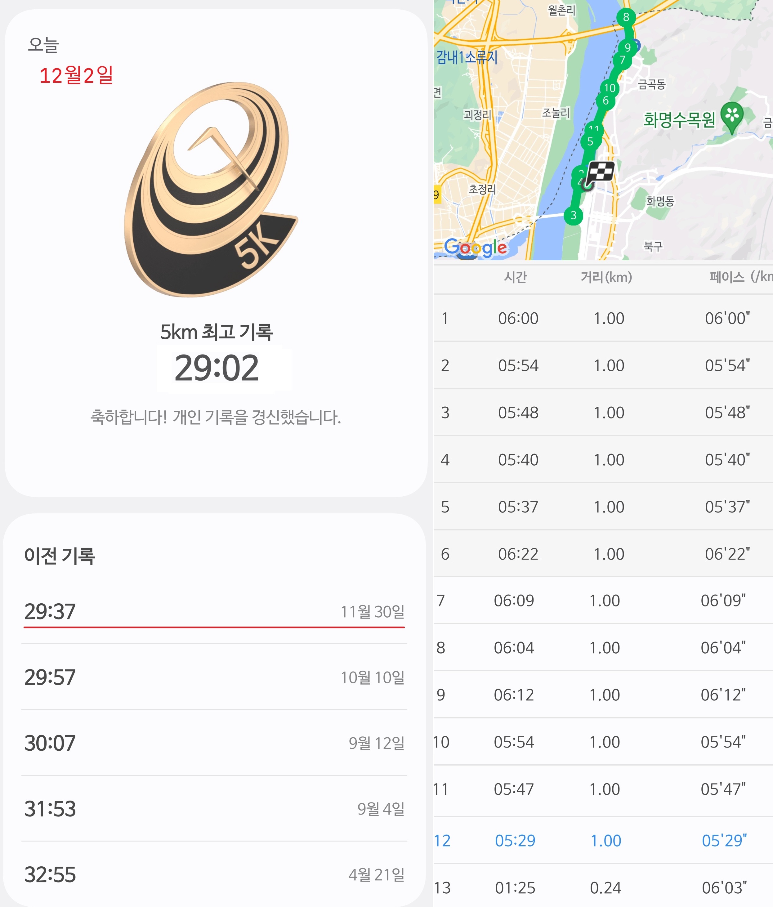11월 마지막날 삼성 와치 알림이 와서 12월 첫 운동인 오늘은 욕심 내서 달렸는데, 역시 25분 안에는 안되는군오! 당연히 안되는데 산수를 첨엔 못했음. 아흐 1km/5분 이하로 25분을 달려야 하는데...아흐. 몸무게 부터 줄여야 함!! 그런데 12.22km(산길쌤)엔 그런데, 5km 최고 기록은 어떤 구간으로 나왔는지 급 궁금해짐! 시작부터 5km면 28분 59초가 나오는데... 우씨..