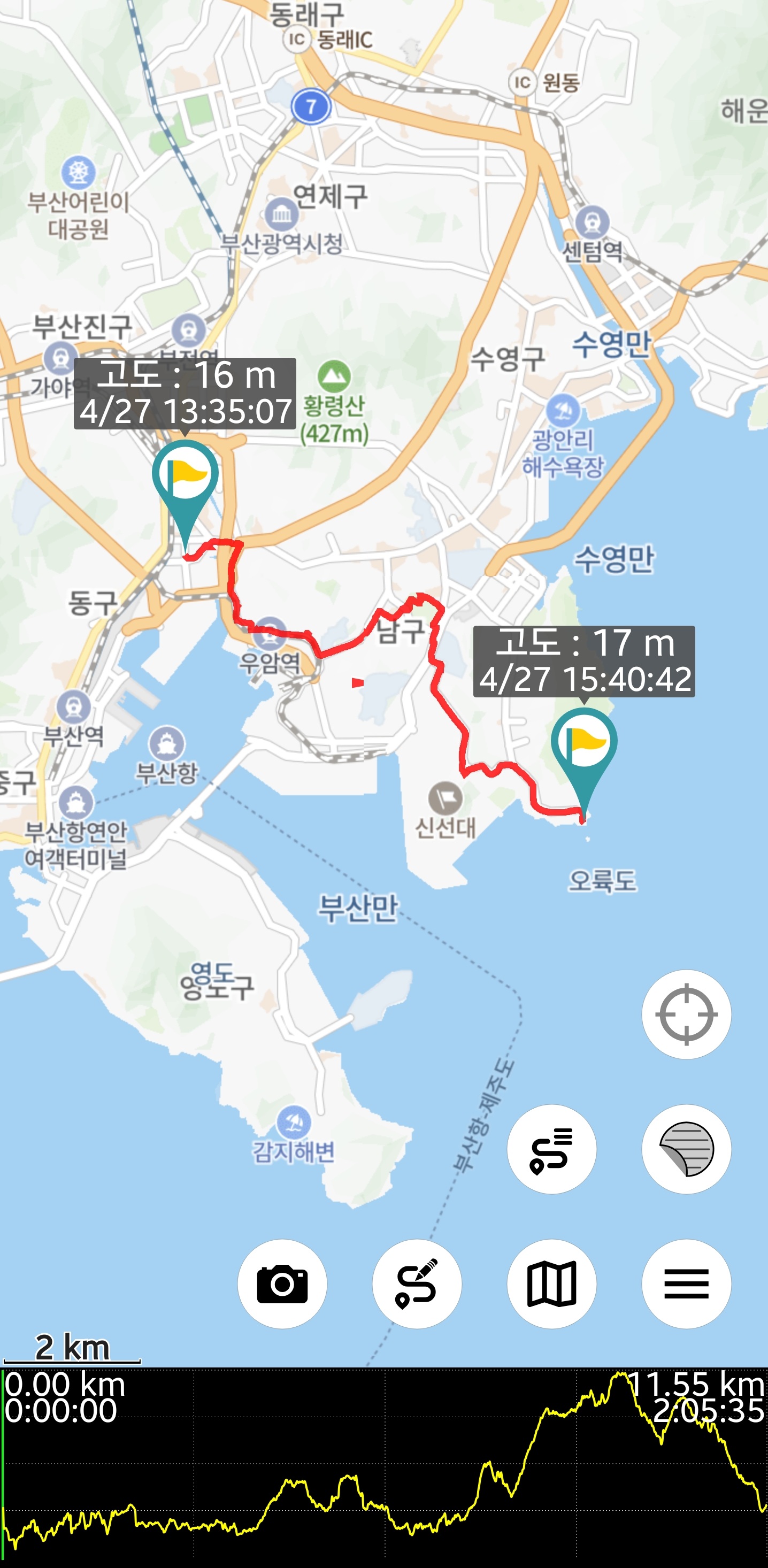 시간: 13:35:07 ~ 15:40:42 (2:05:35) / 부산갈맷길 앱 기록: 02:04:43