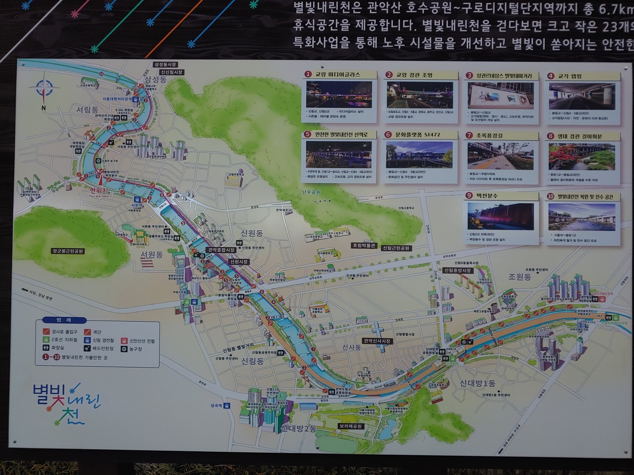 행운초교-봉사리-봉천역-신림역-별빛내린천-신림2교-청룡동주민센터-관악구청-마트-귀가