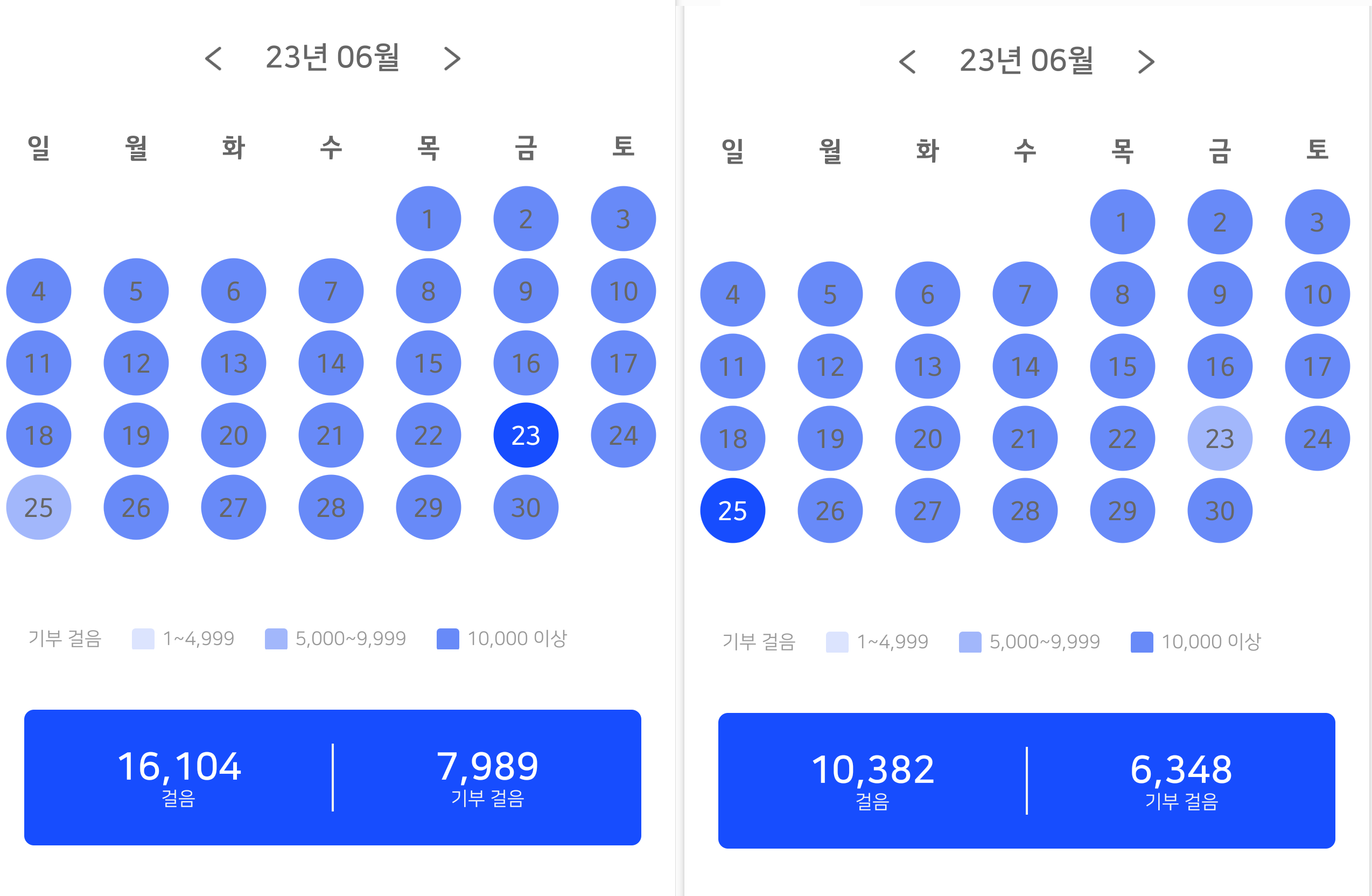 23일과 25일은 만보는 걸었으나, 기부를 잊어 담날 한 바람에 생긴 색깔!