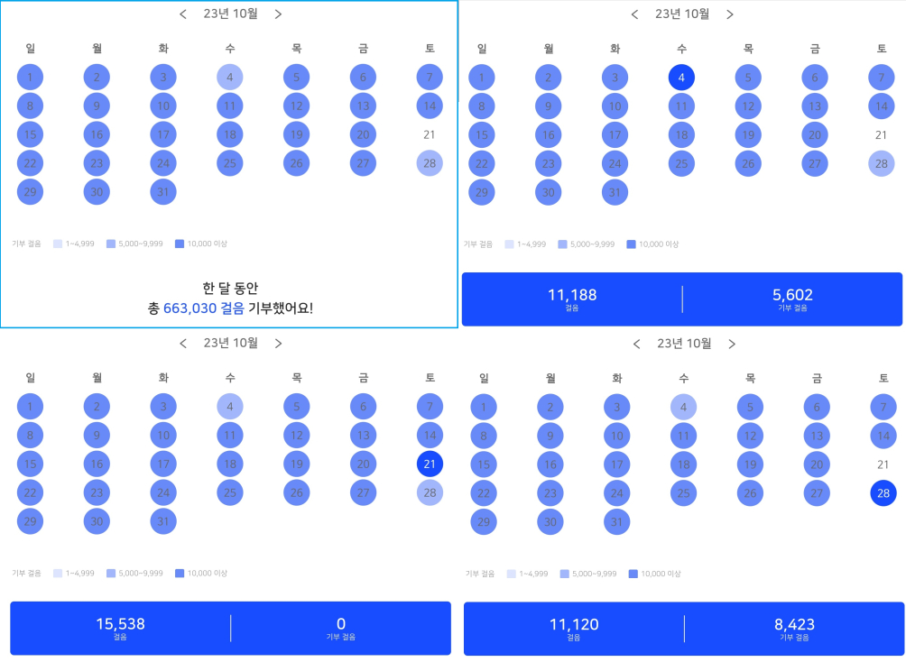 정리 ] 빅워크 앱에서 10월 정리는 편해서^^; 하지만 일만보 기부하지 않은 날이 3일 이나 있었지만 다 보면 일만보 100%인게 보여서 정리해서 올림. 10월4일, 10월 21일, 10월28일 3일간은 걷기는 일만보를 했지만, 기부 걸음이 일만보를 넘지 않아서 표시된 3일간만 있어서 정리해 올려봄.