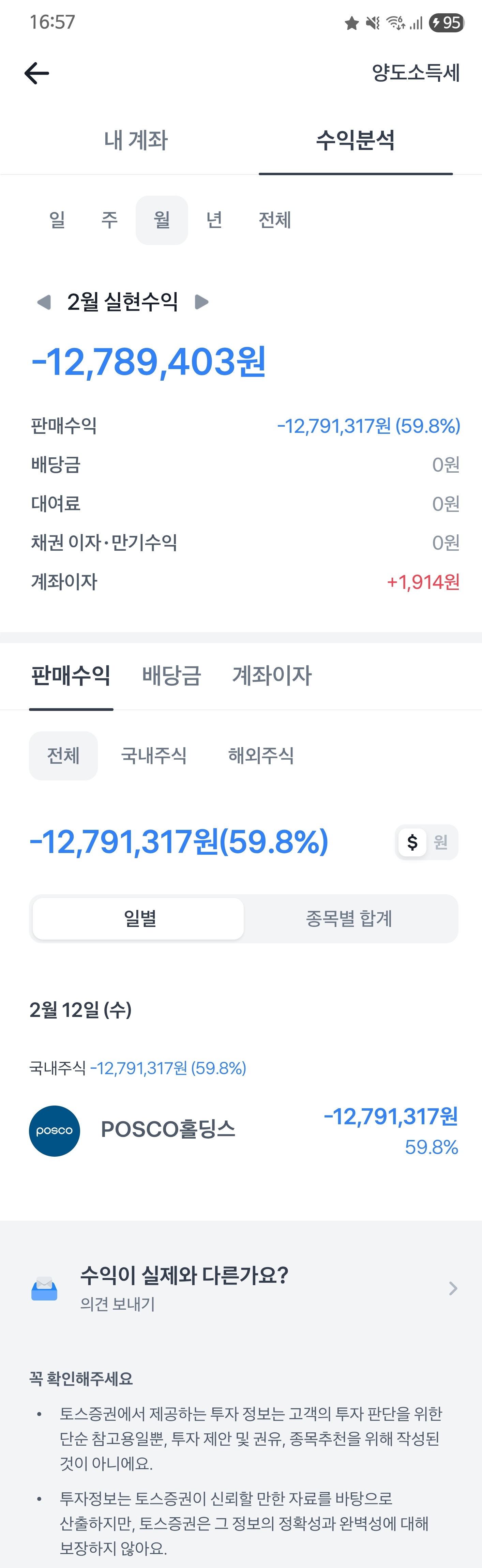 1. 토스에 포스코홀딩스를 2월에 팔아 -12,791,317원 손해를 봤고, 10월31일 기준으로 최종 손해는 -12,075,302원 임. (단타로 80만원 정도 수익을 얻어, 최종 손해 금액이 조금 줄었음. 토스증권 계좌로는 거래도 많이 하지 않음요^^;)