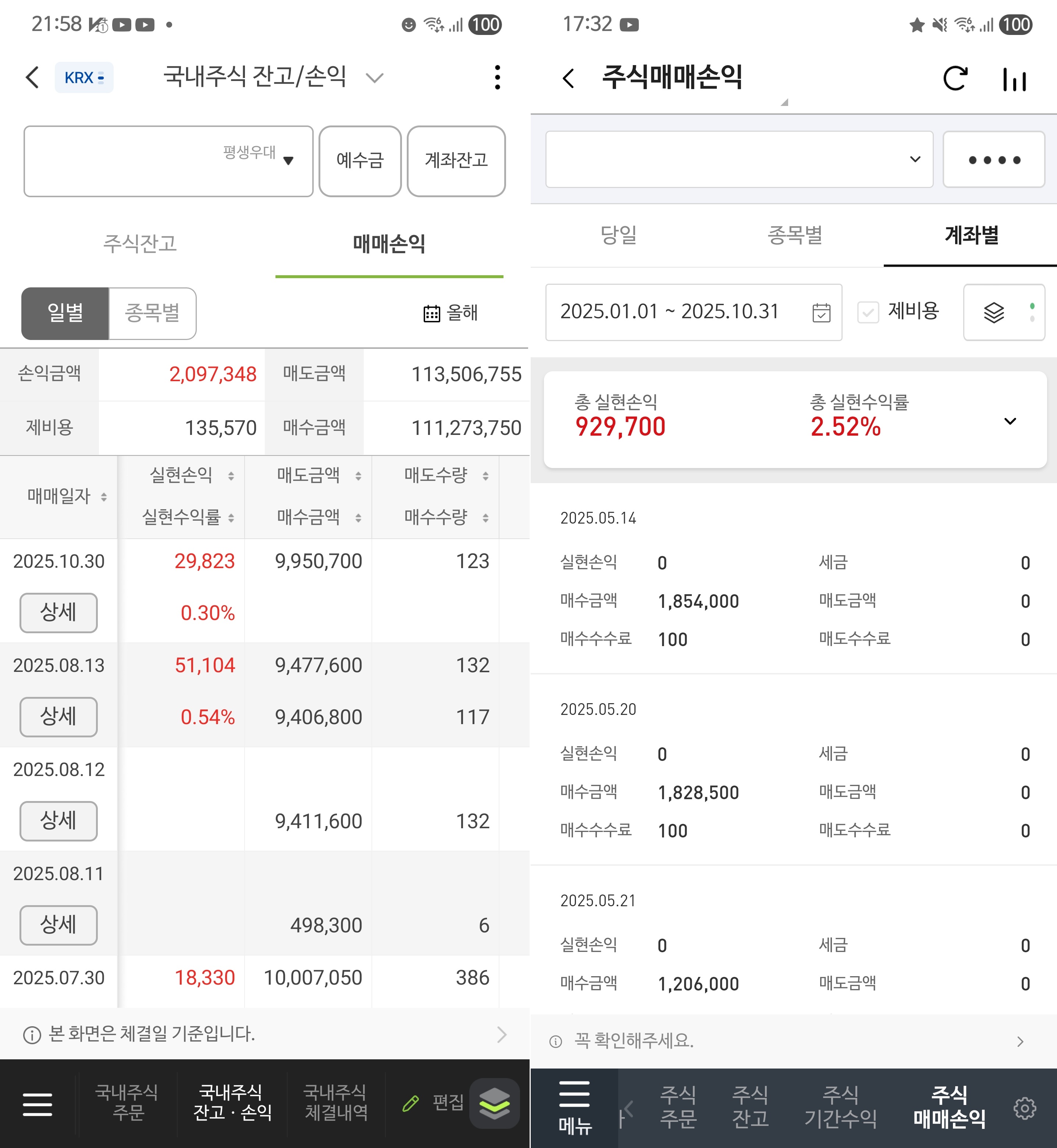 NH 나무증권, DB증권의 수익이 3백만원 정도 되어 2025년은 딱 실현손익이 0에 수렴되었는데, 이전에 년에 1천만원 정도는 수익을 냈기에 ... (8개정도 수익이 났지만, 2종목 정도가 좀 손해. 그래서 큰 수익을 보지는 못했음)...