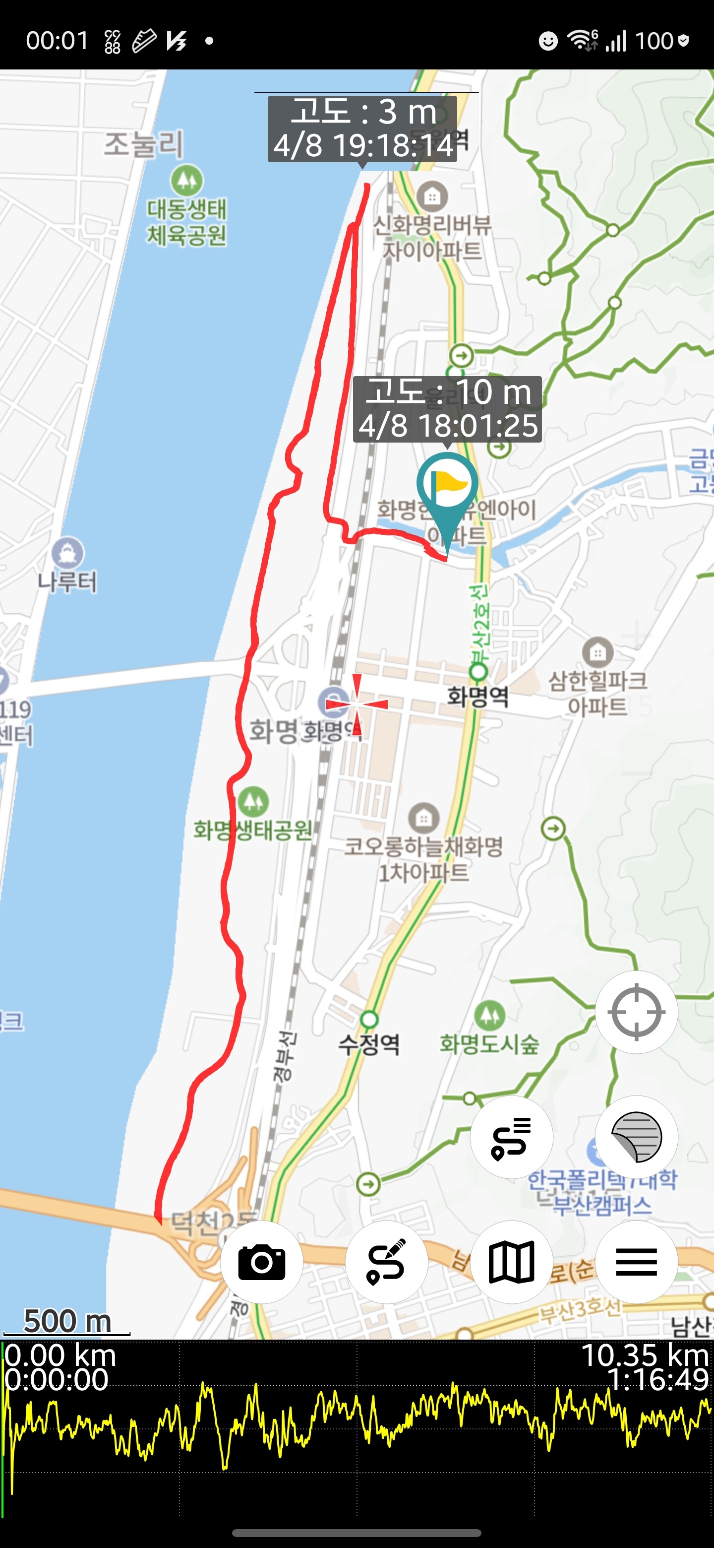 산길샘에서 기록한 것으로 18:01:25~19:18:14 10.35km / 66:49