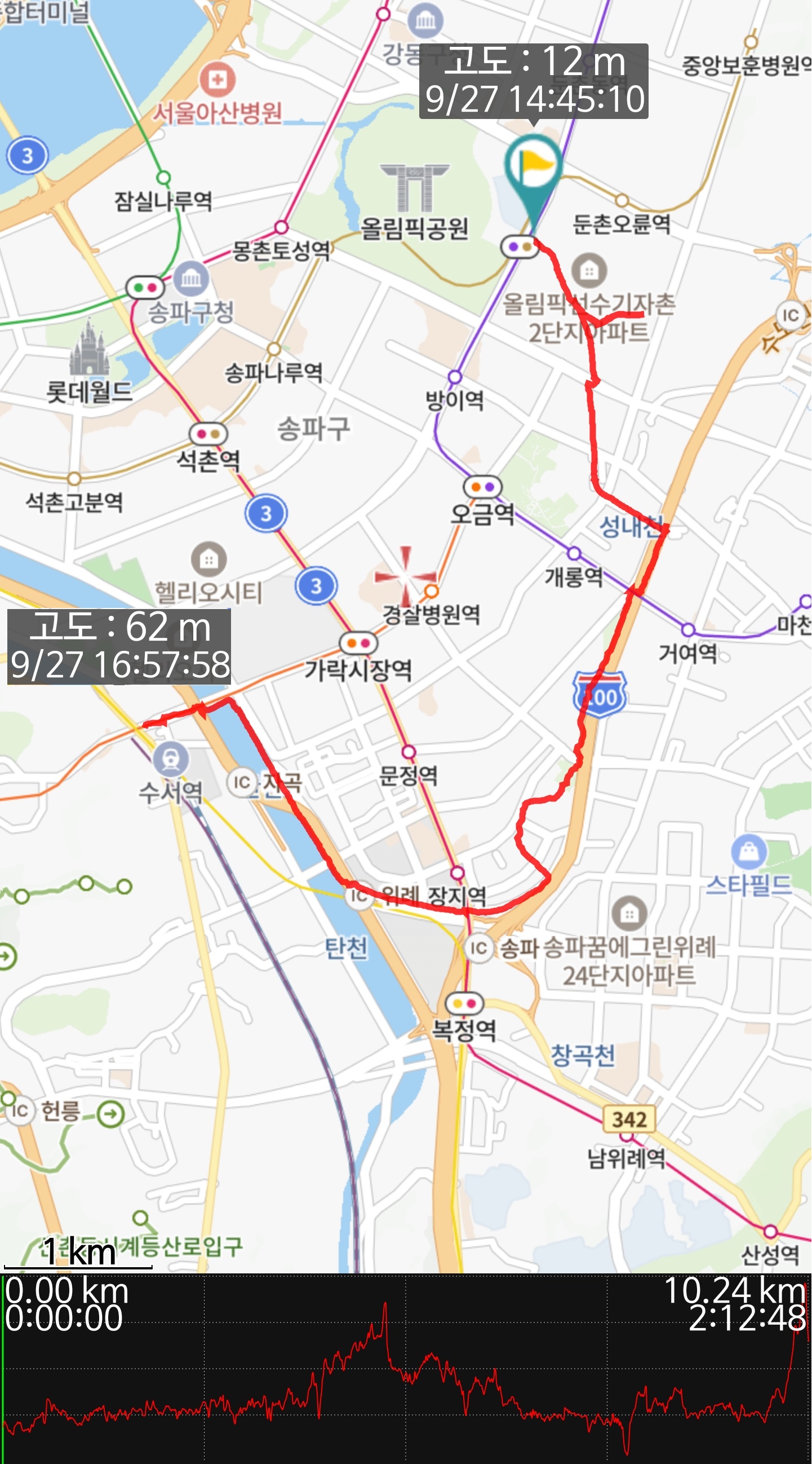 선릉에서 지인을 만나 점심 먹고나서, 올림픽공원과 가까운 것을 확인했고 ... 그렇게 주저하다 09월27일(목) 14:45:10~16:57:58 (1:32:48 달리지 않음) 동안 7코스 마지막 스탬프 받는 곳(길 헤맸음)에서 수서역까지 걸었다. 이렇게 서울 외곽이 나마 걸어보는 것은 나처럼 지방에서 서울 와 사는 사람이라면 꼭 해봐야 할 것 같다. 젊을 때 사는 곳은 처음 정주한 곳에서 벗어나지 못하는 단점(?)에서도 벗어날 수 있는 기회(결혼할 때 또 한번 있긴 하겠는데, 독신이라)도 제공하고, 사는 지역을 주체(?)적으로 정할 수 있는 그 무엇을 줄 것 같다. 뒤늦게 깨닫는 것 보단 말이지! 걷는 내내 오른쪽에 아파트를 두고 외곽을 부지런히 걸었단 기억이. 그렇게 수서도 와보고... 한강은 안양과 다르게 좀더 자연스럽게 가꾼, 그렇군!