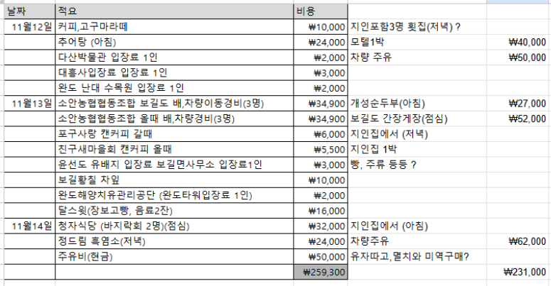 그러나 지인의 경비도 약간 궁금해서 적었는데, 도로비는 하나도 적지 않음*_* 하이패스로 했기에 모름... 따라서 경비를 좀더 부담했어야 했는데, 거의 스무살 차이라 돈 많다고 매번 내가 낸다고 하는 것도 잘 되지 못해서...