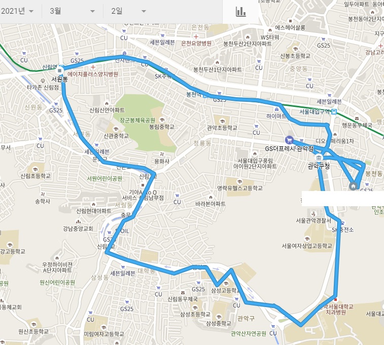여기 살면서 생각해보니, 신림역까지 걸어가서 다시 서*대 정문쪽으로 걸어서 집 복귀. gs더프레시에 가서 올리브유와 아몬드, 호두 구입했음.